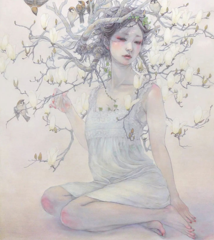 而这些美丽的少女,都是Miho Hirano一笔一画地勾勒出来的,再结合油画技法上色。