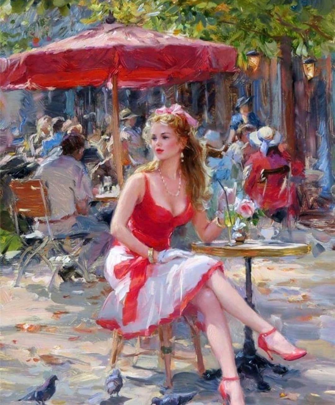 康斯坦丁的画面常出现的背景有干净喧闹的街道,温馨的房间,以及花团锦簇的花园一角其中的人物或站,或躺,又或喝着下午茶