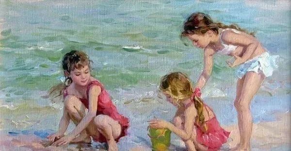 年轻貌美的女性人物在康斯坦丁的作品中占据了一大半的比例但另外一小半的作品中他确钟情于表现田园中嬉闹以及海边戏水的小女孩