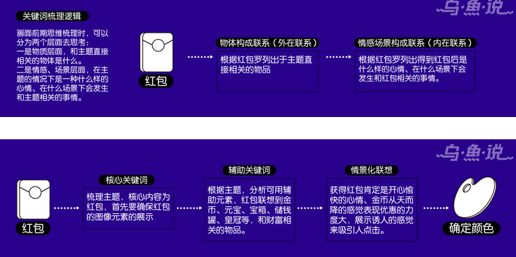 此次活动的主题是买手节以及领取红包页面应用,买手节的主题,我们不仅仅需要从买家的角度去思考画面,我们也可以从卖家的角度去思考,平台有哪些行业,将主要的横向行业的名称整理出来,将名称一一列出来,例如母婴行业、美妆、进口等等。再根据行业的特性提炼最可以代表他们的元素同时又是最容易表达出来(不要把形体复杂化,要考虑图案放小后还可以看清物体)。母婴行业首先想到奶瓶玩具的元素,这类产品绘制出来不会引起歧义,不会让人联想到其他的业务场景。美妆中选取了口红为主体,我们在元素选取的时候还要考虑商品受欢迎程度,不要绘制冷门产品,还有化妆品大部分都是方形容易和其他产品混淆,所以归纳商品的突出特色,口红的造型深入人心。红包插画的元素一定要让用户最直观的感受到红包的元素!不同的用户对图形的理解处理能力也有所不同!直观的表现更容易吸引用户!下面以红包为例,展示一下前期思维逻辑梳理。