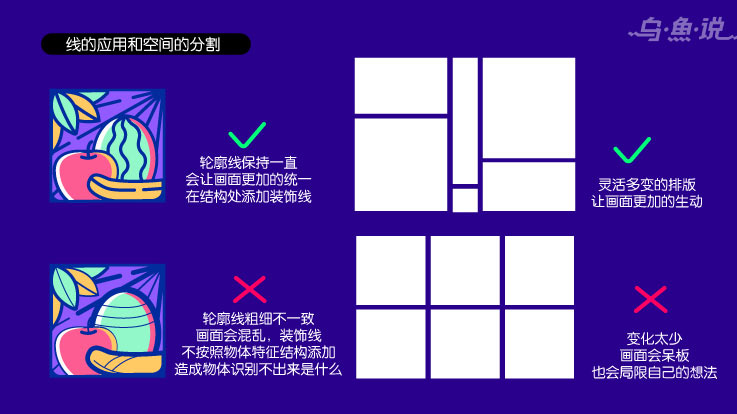 描边的问题解决了,还需要解决一下画面的疏密关系,这类插画大家在绘制过程中,往往容易绘制的特别丰富,但是忽略的画面的疏的部分,画面画的太满就会造成压抑感,统一的主题也不是非常的明确,疏密关系不仅是通过线条的多少决定,也可以更具画面区块的大小来区分,大家在分割画面的时候不要等份分割,而是分割成大小不同的体块,通过不同的体块组合让画面的更加活泼不呆板。不同的体块设计完,可以在不同的场景下组合搭配使用,更加的灵活多变,组合更多效果的画面。