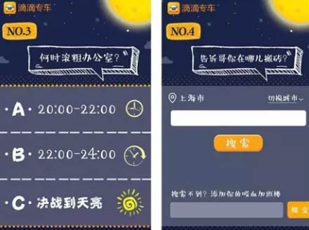 所以我们会看到滴滴的这个活动里面,通过不断的问答方式,一句一句地去问你加班的情况:“你是不是这样的一个情况?你来选ABCD”。