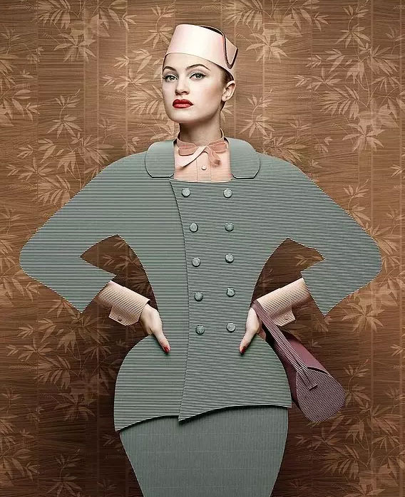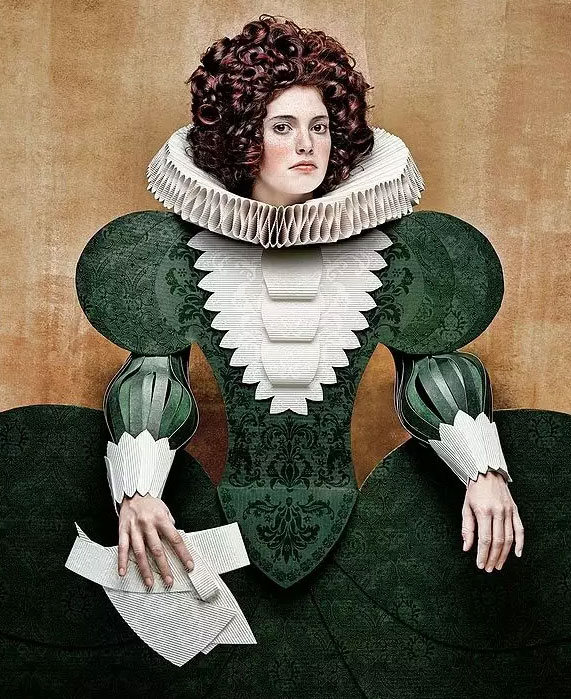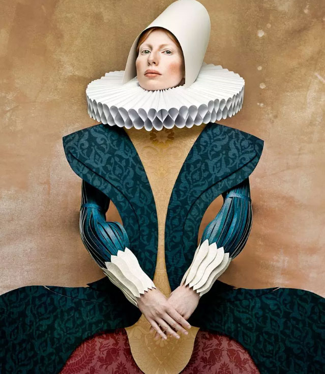 Tagliavini的肖像作品还不至于此,一起来看看《Dame Di Cartone》中夸张的造型,他使用了过去各个时代的流行装饰,风格横跨立体派、17世纪和20世纪50年代的流行,那些笔挺、繁复又怪异的服装造型,全部使用厚纸板和其他纸类素材呈现。“视觉在两维和三维之间游走,她们不是纸娃娃也不是真正的女性,只是忧郁而特色鲜明的人物。”