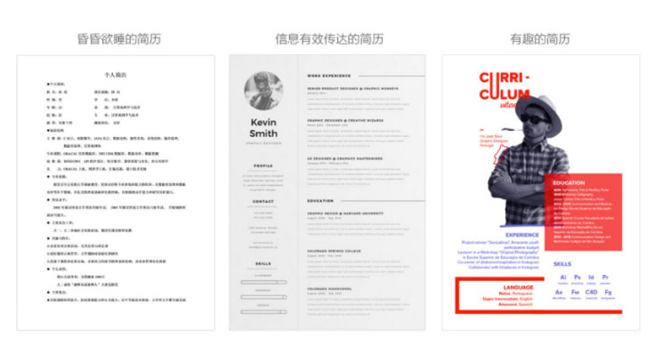 组织页面信息的首要任务是判断信息优先级,分清重要信息与次要信息,删除无用信息。化繁为简,降低视觉干扰。举个小例子,从一份简历,就可对一名应聘UI设计师的平面设计基础能力略知一二。首先对无用信息的判断(讲真,曾看到简历中还有体重信息)。其次是关键信息的组织排列、清晰表达。个人信息:姓名、年龄、照片、联系方式;基本信息:工作经历、教育背景、职业技能;其他信息:兴趣爱好等。数份简历扎堆时,信息有效快速传达是第一步,再者才是加入一点点自己的小个性。