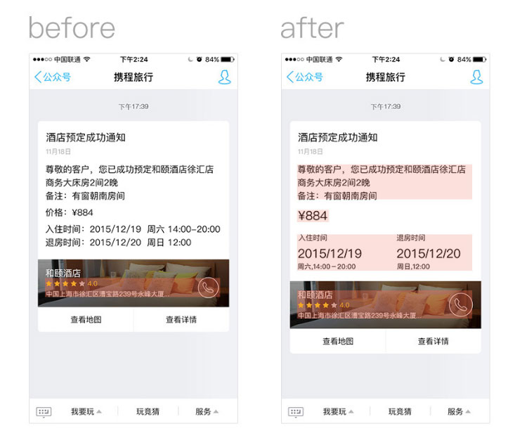先从一个酒店预定成功通知消息案例来看,通知信息文字平铺直叙,并未合理分组(左图)。图片部分上方酒店评价、信息地址和电话操作按钮剧中对齐,酒店名成为了一个小标题。做适当调整后(右图),使得正文通知、价格和时间字段分组明确。电话按钮同酒店信息组对齐,使得图片区域的文字和操作信息更为整体。