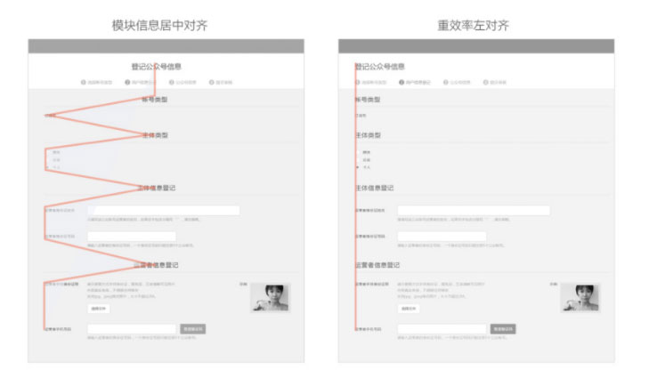 信息分组后,居中排列每组信息的小标题,模块感增强,使得阅读标题和每个组信息中产生视线的跳跃。小标题和每组信息统一居左对齐,更符合快速浏览和操作。比如在需要完成注册任务的网页中,标题居左更有利于视线快速向下流动,使得操作路径更顺畅。
