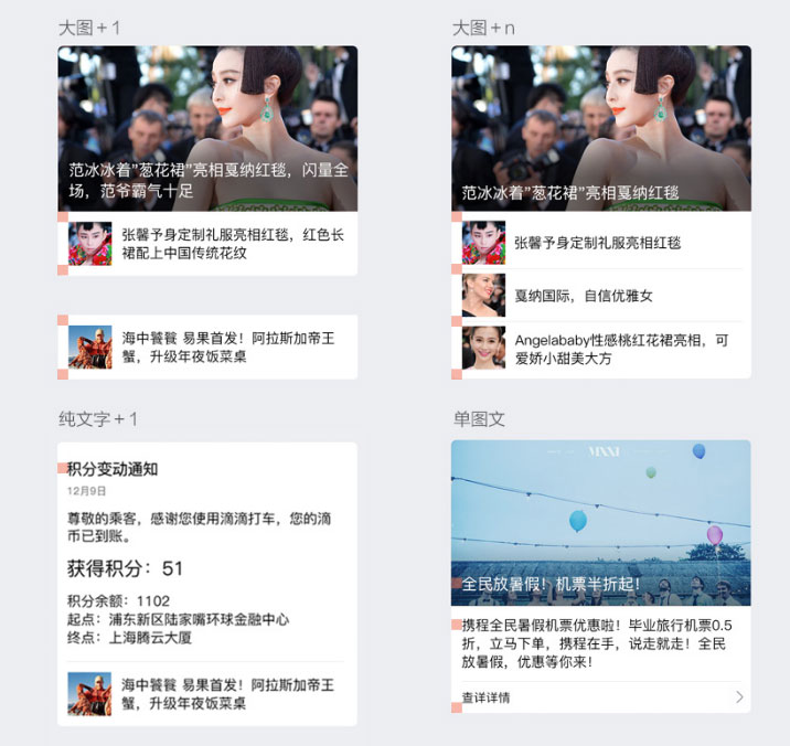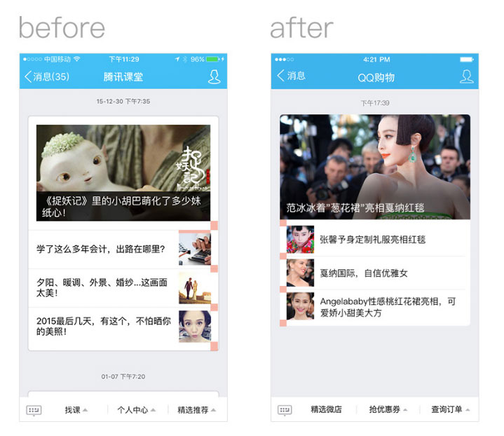 在手Q公众号图文消息优化中,我们发现线上旧的图文消息边距较为肥厚,在大图+1小图的情况下由于代码的模块化拼接,始终无法达到完美的像素间距。在考虑多种纯文字、单图、多图文模版拼接后,尽量减少间距规则和字号种类,达到拼接模版的统一规则。保证一致性为前提,也提供灵活拼接的多样性。