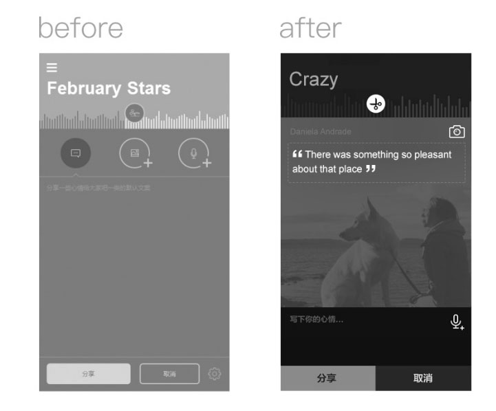 在某电台app概念设计中,分享功能支持获取歌词并同时拉取专辑封面配图,允许用户上传照片、写下当时的心情或是用语音表达。最初设计时的界面交互框架(左图)默认功能在“写下心情”,“加图片”和“录语音”的功能重要性并列,感受上是个功能强大的分享界面,告诉用户你有三种选择配心情内容的方式。讨论后优化框架(右图),默认拉取专辑封面图,支持上传图片入口置于右上角,默认歌词展示在封面图上可点击编辑,整个页面可视化了最终分享出去的样式,所见即所得。设计优化后,让整个操作有了重点。可以直接在分享预览图上操作,缩短了分享路径,最重要带给用户轻量化的操作感受。