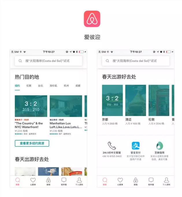 爱彼迎的热门目的地和出游去处模块,典型采用了3 : 2的比例,大家可能想问为什么图片尺寸有单数,其实这里是根据屏幕的(宽度-间距)/图片数=图片宽度,因此这个图片不是固定的而是等比例缩放的,高度根据比例在进行计算,有时候计算出来的数可能并不是一个整数,因此需要我们自己去选择一个整数来运用。其他的尺寸比例也是一样的。