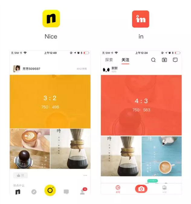 看上图我们知道,同屏的情况下4 : 3图片占比更大,因此在同屏显示中这一比例相对于3 : 2展示的内容就较少。因此在设计中,我们也可以从产品目的定位来判断,是以内容为主还是以图片为主,例如in大多为女性用户,是以图片为主的APP因此他采用了4 : 3的比例。而Nice虽然和in类似,不过其产品目的定位是以内容为主,因此他选择可展示更多内容的3 : 2的比例。