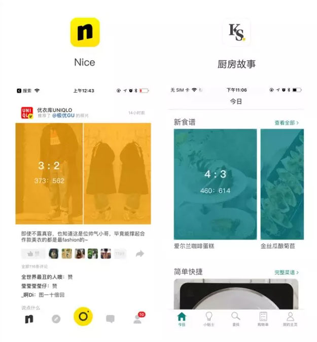 这里我用Nice和厨房故事来比较,Nice我们知道以展示内容为主,因此他的图片大多采用3 : 2的方式,其优势就是在同样的横屏大小中,这一比例可露出更多的图片信息。而厨房故事主要是以美食类的图片为主,因此为了图片更好的展示,因此他的图片大多采用4 : 3的比例。