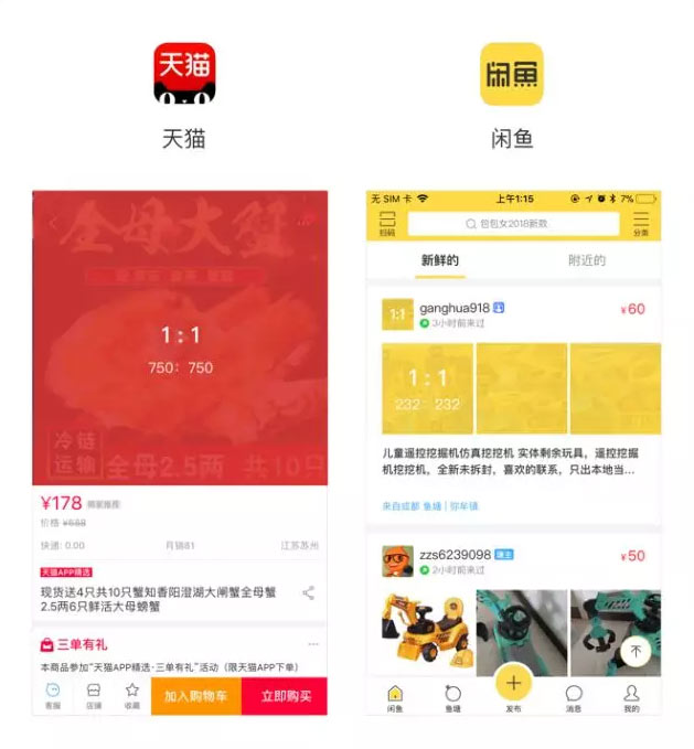 闲鱼的产品图由于多为用户上传,图片的比例或者质量都不统一,因此也多采用1 : 1比例进行设计,另外头像往往也是以1:1的比例设计。