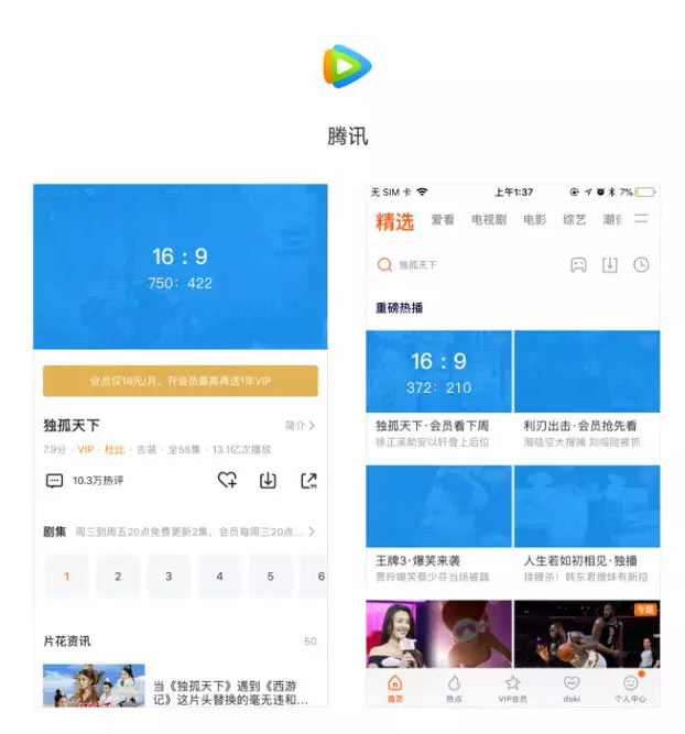 在设计时,图片的尺寸设定和这些拍摄器材有很大的关系,因此在视频类的APP中大多用16 : 9的比例。