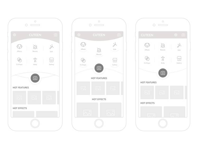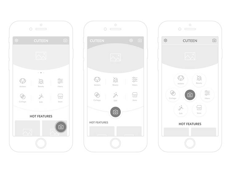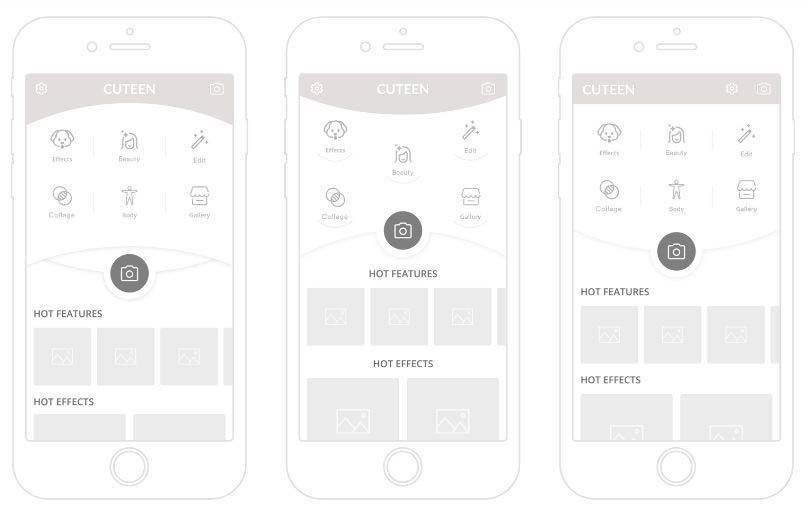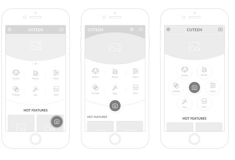 Cuteen 这个 APP 包含6个基本的功能,这些功能需要以最有效的方式呈现。设计师提供了两种不同的布局方案。第一个方案当中,包含了顶部的圆形 Banner 和品牌名称,设计师设计了包含基本功能的图标和拍照按钮的若干布局变种。其中拍照按钮作为优先级最高的交互元素,它应该有行为召唤的特点,所以它和背景其他元素应该有着足够的对比。